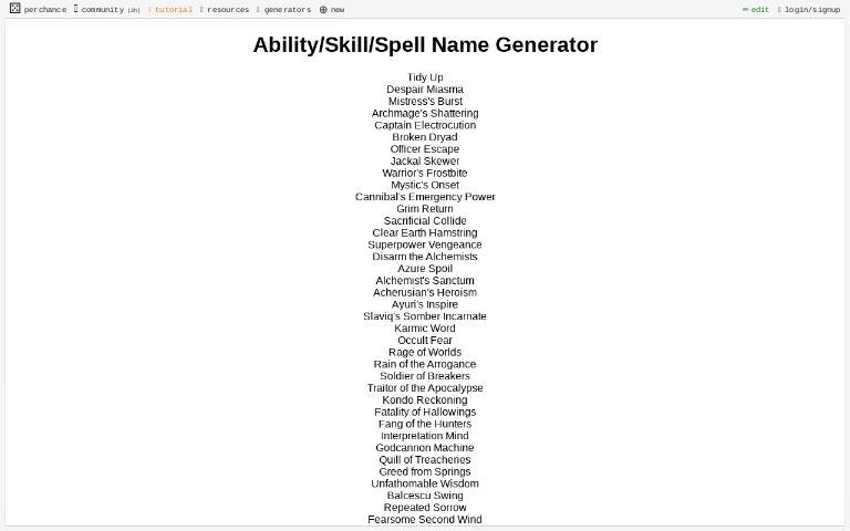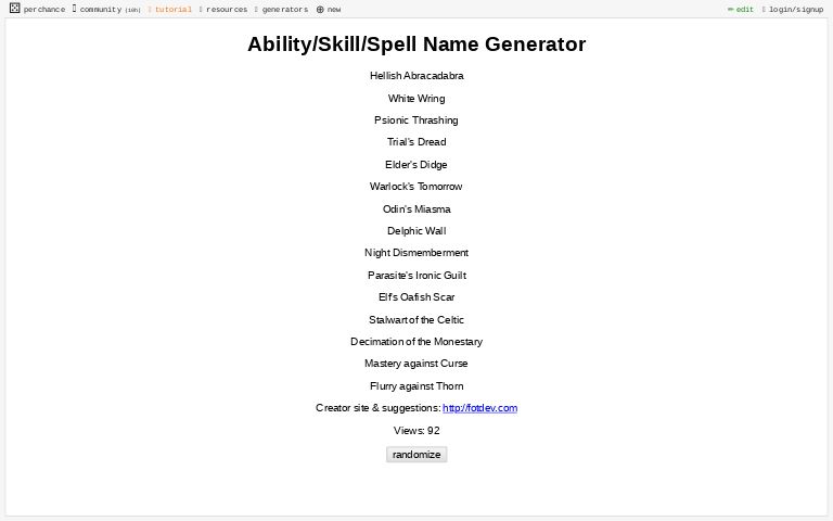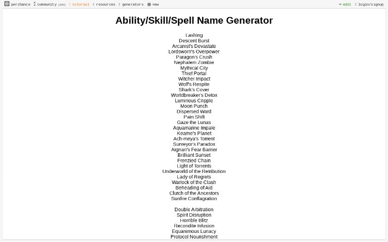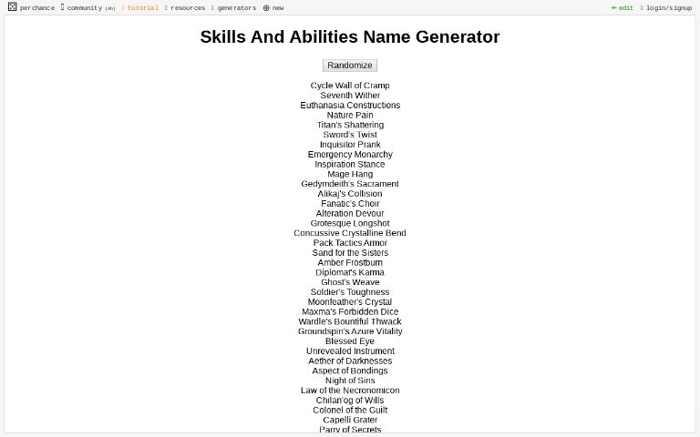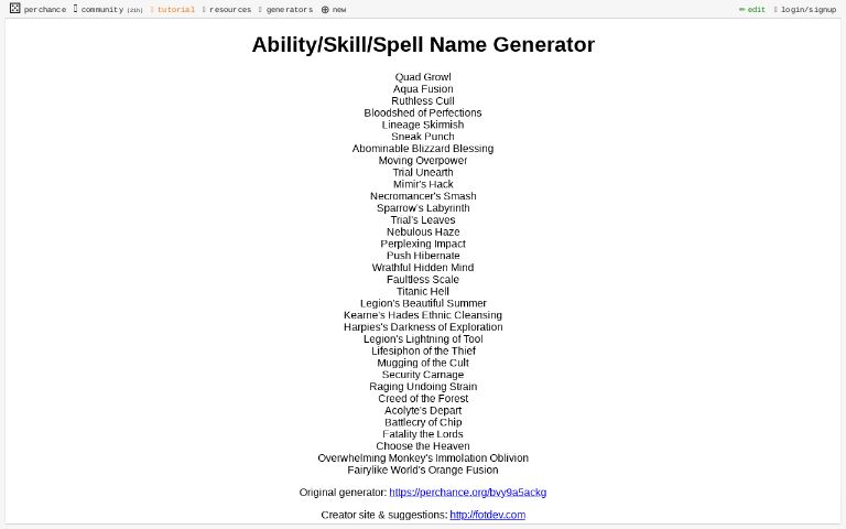 This is a list of the top 10 weapon ability names for 2022. The names all relate to their respective element,. ⚄︎ perchance 👥︎ community 📚︎ tutorial 📦︎ resources 🎲︎ generators ⊕︎ new 🔑︎ login/signup ️︎ edit ability generator acceleration acceleration is the ability to strengthen, increase and improve one's own abilities. Following is a list of all the abilities that can be generated by the abilities generator. Ability name generator ― perchance ability name generator jonkouski's sonic randomize randomize and try to draw the ability in action!