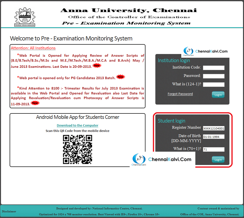 Anna University COE Web Portal coe1.annauniv.edu Auupdates