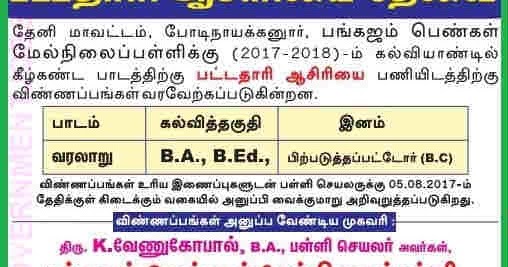 Pankajam Girls Higher Secondary School Bodinayakkanur Theni Recruitment of BT Assistant History
