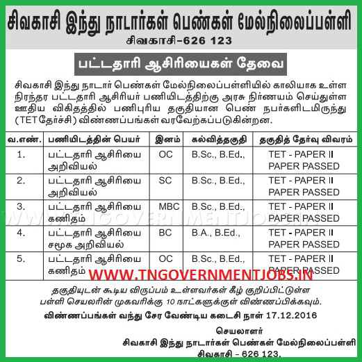 Sivakasi Hindu Nadar Girls Higher Secondary School Virudhunagar Recruitment of BT Assistant