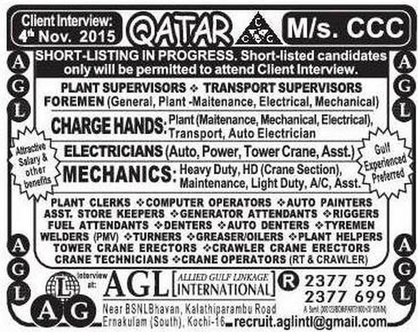 CCC Company jobs for Qatar Gulf Jobs for Malayalees