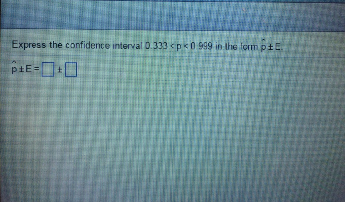 Express the confidence interval 22 % < p < 32.2 % in the form of p ± e. Add two values then divide by two =.118 subtract two values then divide by two =.039 format answer as. They have told us to express our confidence interval. Express the confidence interval (0.079,0.157) in the form of ^p−e<<strong>p</strong><^<strong>p</strong>+e. You'll get a detailed solution from a subject matter expert that helps you learn.