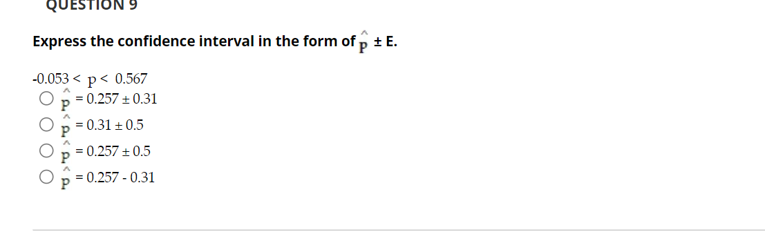 The confidence interval is 0.222 less than the actual number. We find the range of this interval: Express the confidence interval 0.222 < p < 0.888 in the form p± e. Express the confidence interval 0.039 < p < 0.479 in the form of p ± e. Express the confidence interval using the indicated format.