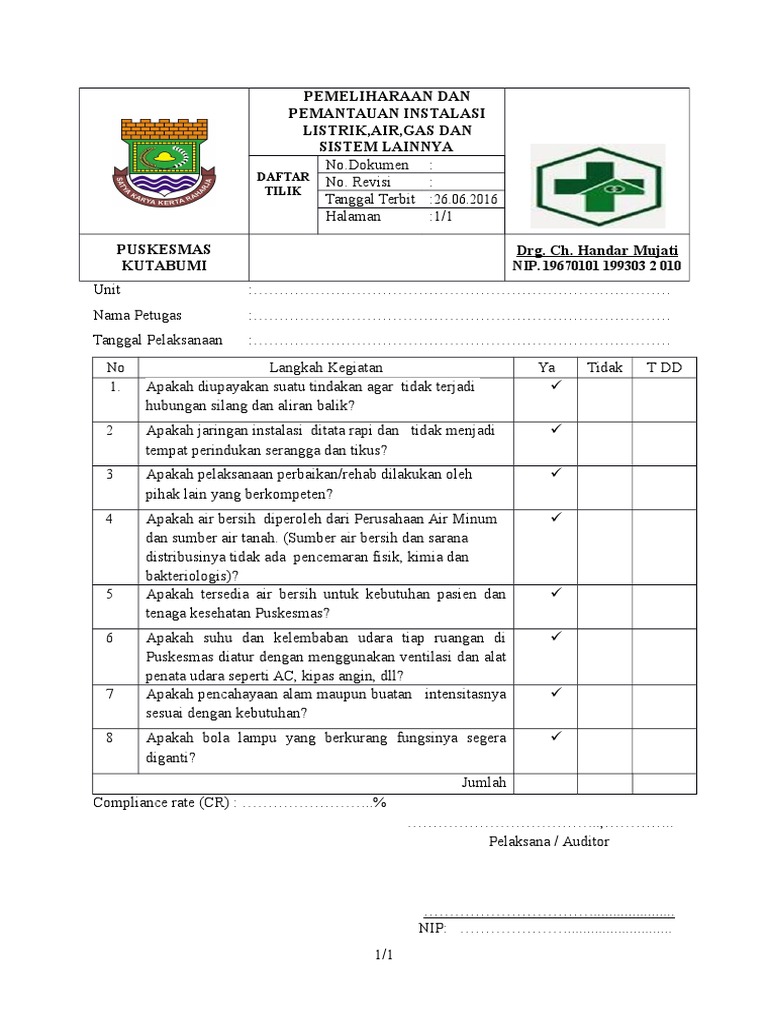 Form Pemeriksaan Harian Instalasi Air , Meter Air Dan Panel Listrik New Revisi