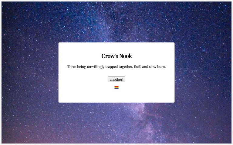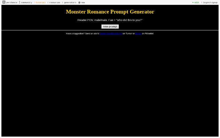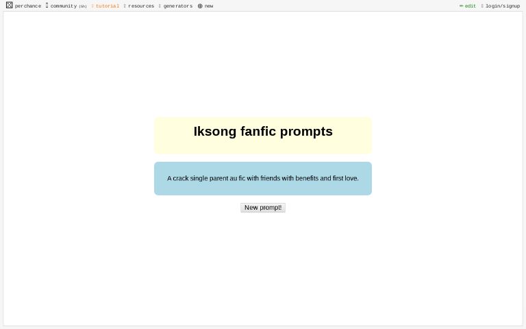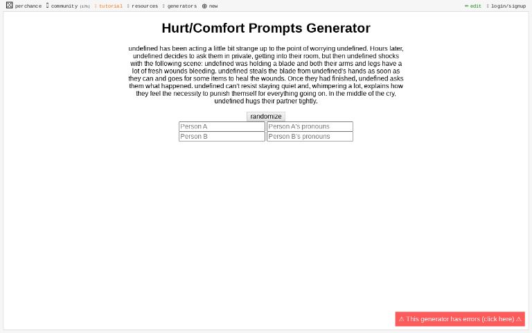 This generator is used to make prompts for a couple. Hurt/comfort prompt generator ― perchance hurt/comfort prompt generator hurt character a generate character b is choked by hivemind vines in an act of self sacrifice. The previous otp prompt generator was taken down, so we decided to bring it back! It helps to generate funny otp prompts or fluffs and funny conversations with the names of your partner, friends, and family members. Send me a number with a ship and any other details you want.