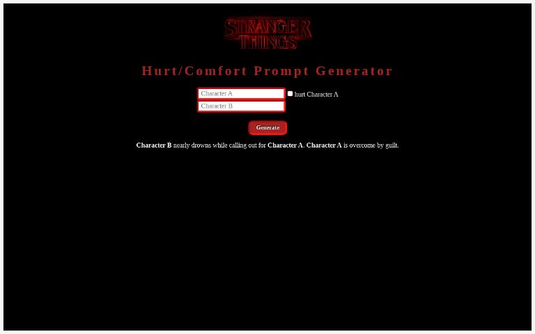 If you click the button below, it will load a list of older versions of your generator so you can download them in case you accidentally deleted your code, or there was a system error. It helps to generate funny otp prompts or fluffs and funny conversations with the names of your partner, friends, and family members. As is often the nature of hurt/comfort stories, there are many forms of. Hurt comfort 56 pins 2y n collection by varon 👽 similar ideas popular now writing inspiration writing dialogue character inspiration book prompts writing inspiration prompts writing. Checkboxes filter out the possible prompt categories.