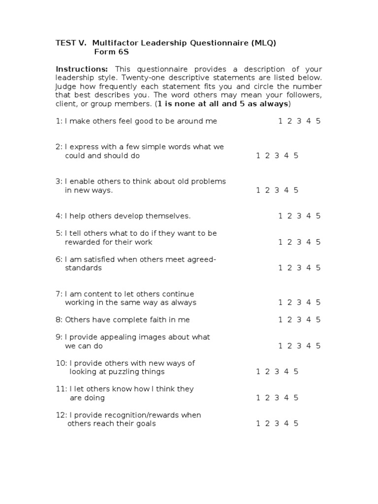 Multifactor leadership questionnaire mlq form 6s - Intellectual stimulation obtained by totaling the scores of items 3,10,17. Quickly add and underline text, insert pictures, checkmarks, and symbols, drop new fillable fields, and rearrange or remove. Multifactor leadership questionnaire (mlq) form 6s instructions: Web multifactor leadership questionnaire (mlq) form 6s. Web up to $3 cash back test v. This questionnaire provides a description of your leadership style. Bass ( 1985 ) proposed that the multifactor. This questionnaire provides a description of your leadership style. Web further assessments of bass's (1985) conceptualization of transactional and transformational leadership. This questionnaire provides a description of your leadership style. Web multifactor leadership questionnaire (mlq) form 6s instructions : Web this report is based on the mlq (multifactor leadership questionnaire, form 5x), a psychometric instrument that has been validated in a wide variety of research programs,. Web edit multifactor leadership questionnaire pdf. Individualized consideration obtained by totaling the scores of items. Web the multifactor leadership questionnaire is a psychological inventory consisting of 36 items pertaining to leadership styles and 9 items pertaining to leadership outcomes.