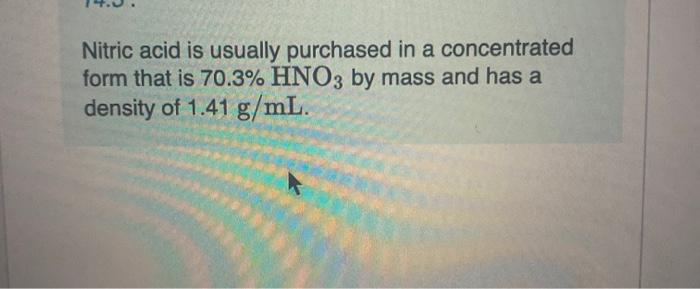 Web nitric acid is usually purchased in a concentrated form that is 70.3% hno3 by mass and has a density of 1.41 g/ml. Web nitric acid is usually purchased in concentrated form with a 70.3 % hno _3 concentration by mass and a density of 1.41 g / ml. So if we have 70.3% nitric acid and for every 70.3 g a channel three, we have 100 g of solution. Part a how much concentrated solution would you take. Web nitric acid is usually purchased in concentrated form with a 70.3% hno3hno3 concentration by mass and a density of 1.41 g/mlg/ml.