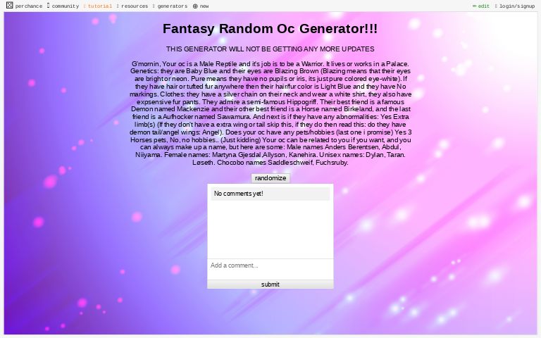List of perchance pokemon generators; Web i made an oc generator if you are bored or just want to create a sona related to centaurworld, this is the generator for you! I embedded a comment section inside of it so. Web genshin impact oc generator want to create an oc but don't know where to start from? I was playing with a lot of random generators and i saw there was some on here.