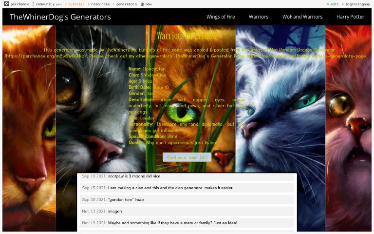 Web warrior cat generator ― perchance. Web i made an oc generator if you are bored or just want to create a sona related to centaurworld, this is the generator for you! Make an oc ― perchance generator Web if you click the button below, it will load a list of older versions of your generator so you can download them in case you accidentally deleted your code, or there was a system error. Web oc generator by bluefox113 1.1k 24 13 idk.