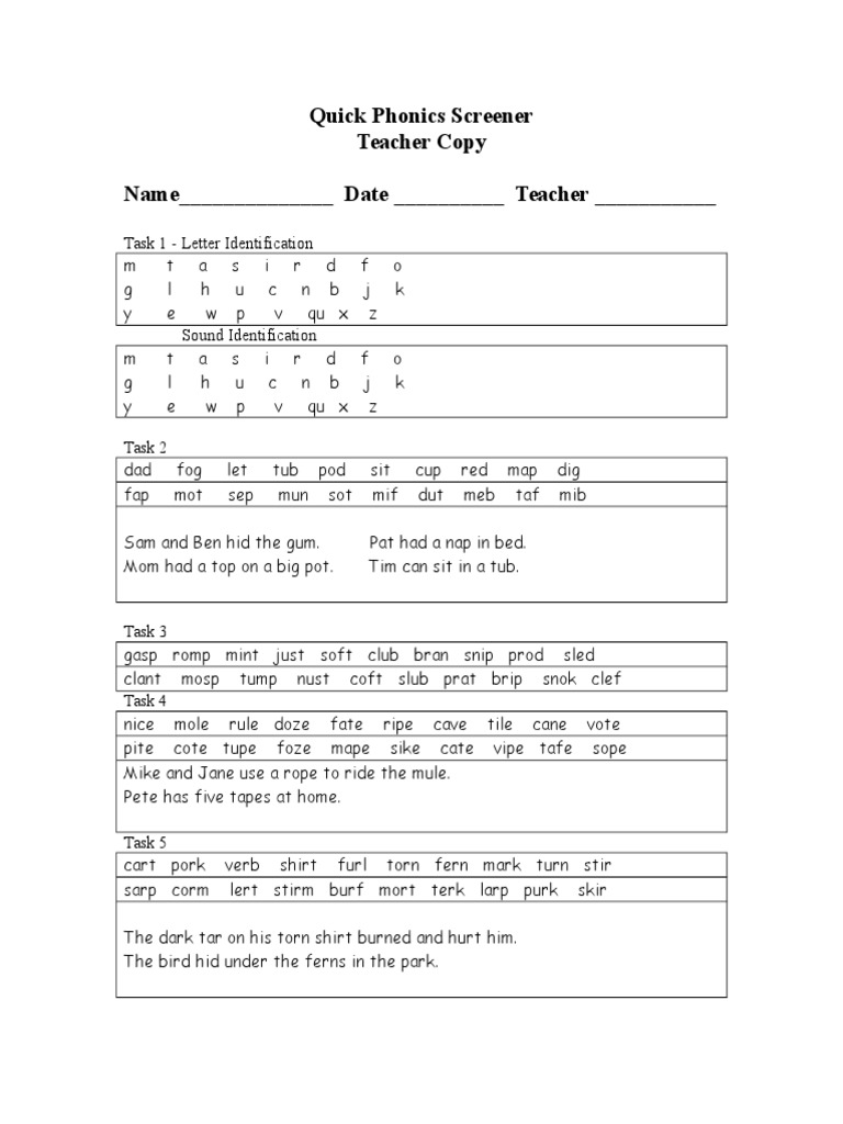 Quick Phonics Screener Grade Level Equivalency Tedy Printable Activities