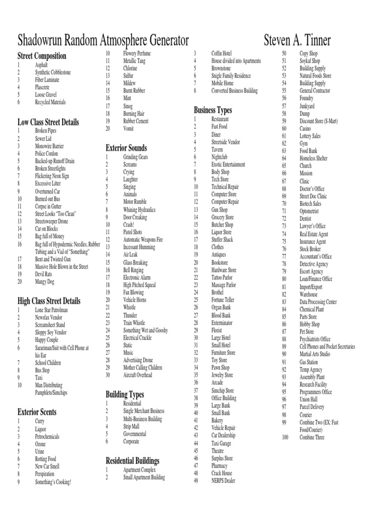 Web hit generator to generate random natural disaster name content. Tinner street composition 1 asphalt 2 synthetic cobblestone 3 fiber laminate 4 plascrete 5 loose gravel 6. Shadowrun random atmosphere generator25 correction fluid26 melted plastic27 cordite28 gasoline29. They could be configured to produce different environmental mixes. Web atmosphere generators are terran devices used for providing a breathable atmosphere in areas where such an atmosphere isn't present.