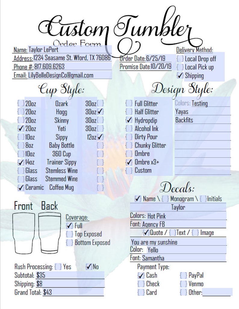 DIY Editable Custom Tumbler Order Form With Invoicing Sections Etsy